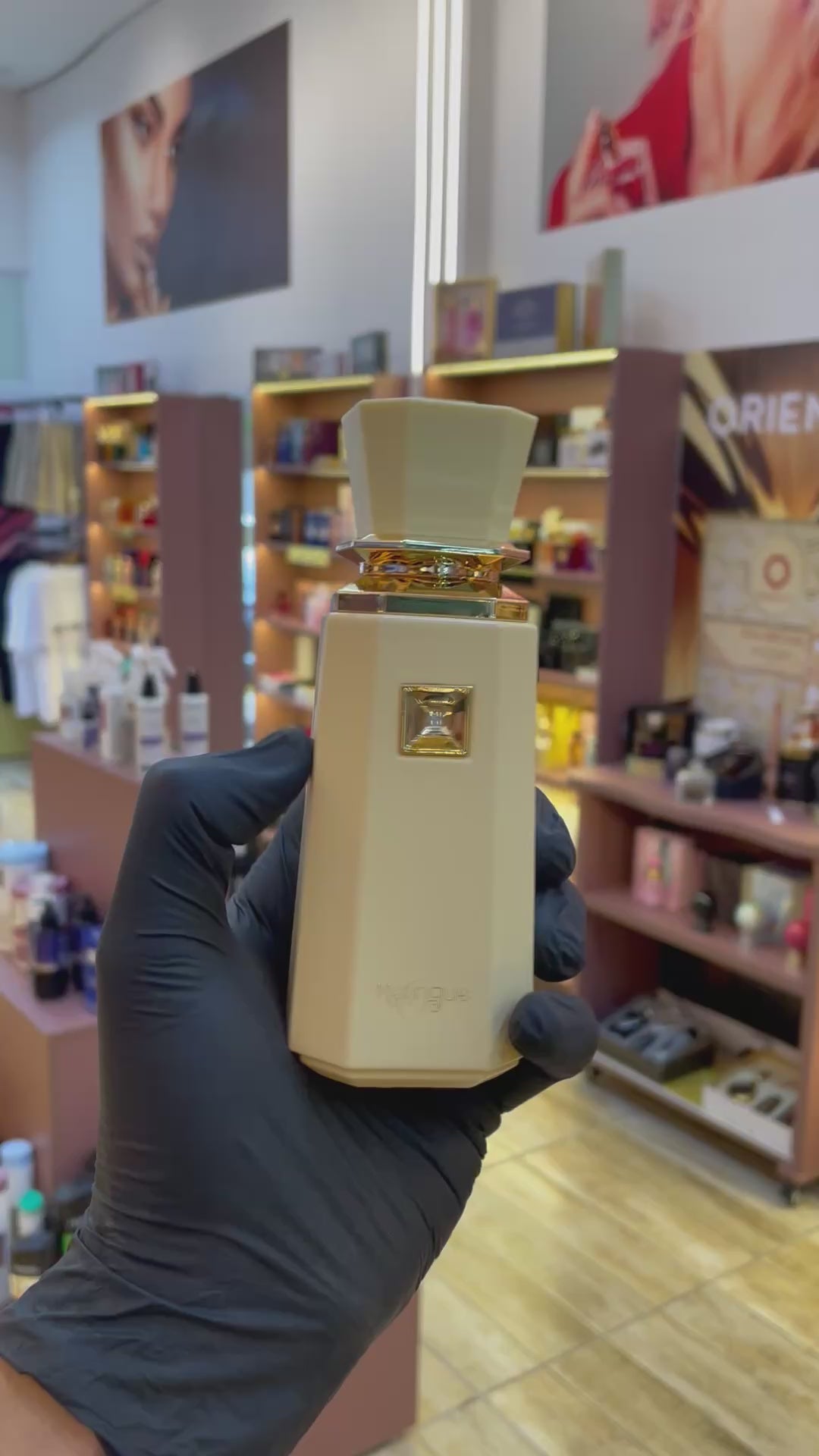 O frasco tem um design sofisticado e moderno, com uma cor cremosa que reflete sua fragrância.